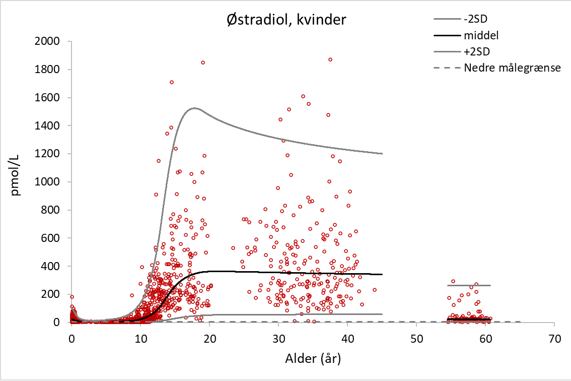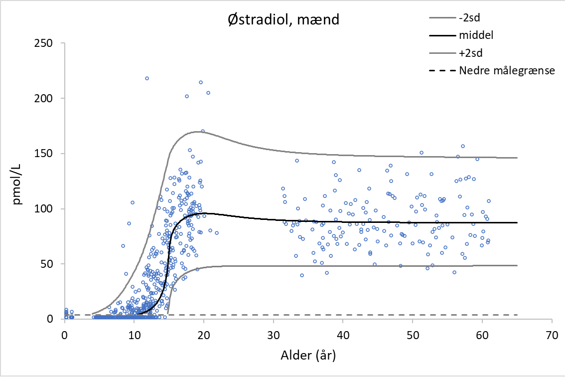 | Referenceinterval: | Reference materiale er baseret på udvalgte prøver fra forskellige populationer (det københavnske minipubertets studie, den københavnske mor-barn-kohorte, den københavnske pubertetsundersøgelse (COPUS II), Glostrup Helbred 2008-undersøgelse, samt prøver fra to studier af hhv. piger og voksne kvinder udført på hhv. Århus Universitets Hospital og Rigshospitalet, se reference nedenfor). Normalmaterialet indbefatter 1301 raske piger og kvinder og 772 raske drenge og mænd i alderen 0-61 år. Referenceområdet er inddelt i alder og køn.