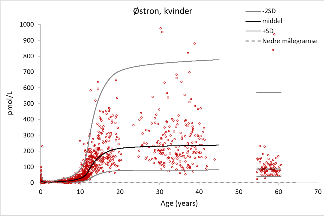 | Referenceinterval: | Reference materiale er baseret på udvalgte prøver fra forskellige populationer (det københavnske minipubertets studie, den københavnske mor-barn-kohorte, den københavnske pubertetsundersøgelse (COPUS II), Glostrup Helbred 2008-undersøgelse, samt prøver fra to studier af hhv. piger og voksne kvinder udført på hhv. Århus Universitets Hospital og Rigshospitalet, se reference nedenfor). Normalmaterialet indbefatter 1301 raske piger og kvinder og 772 raske drenge og mænd i alderen 0-61 år. Referenceområdet er inddelt i alder og køn.