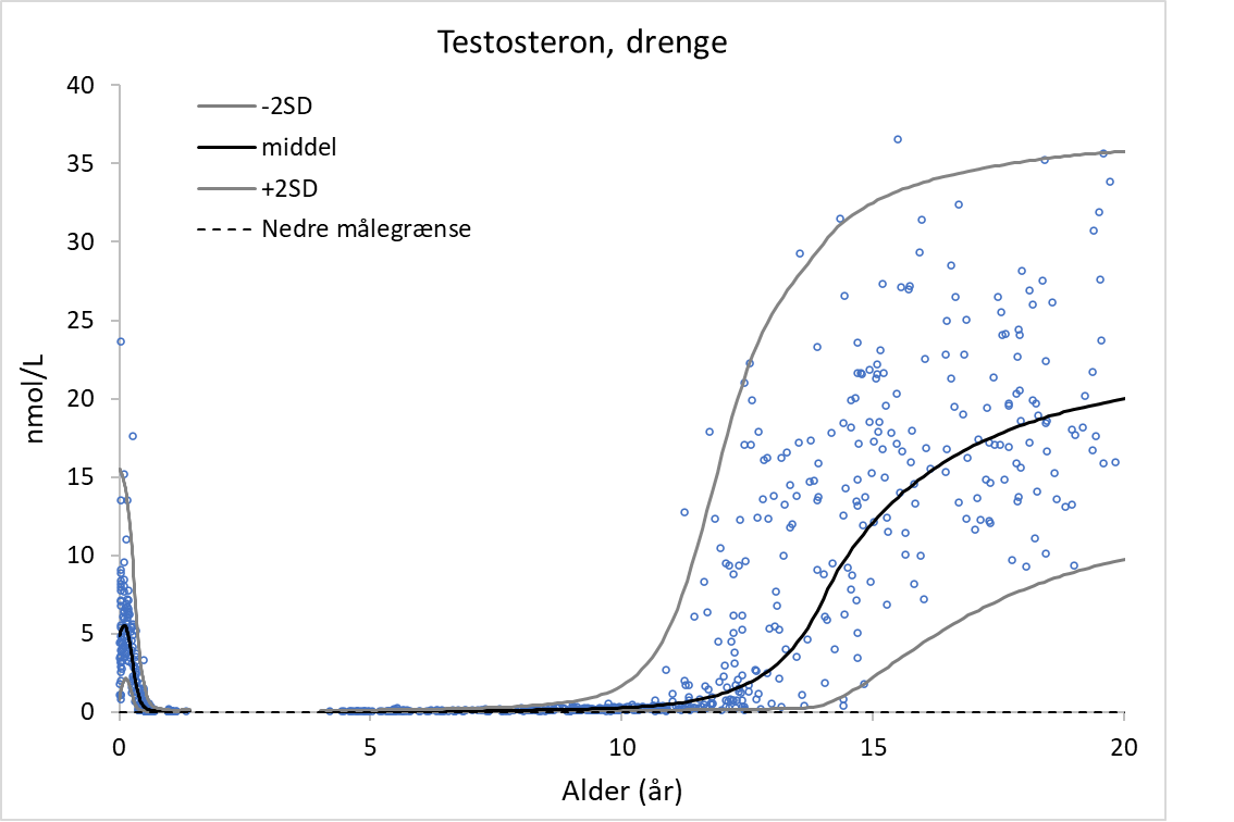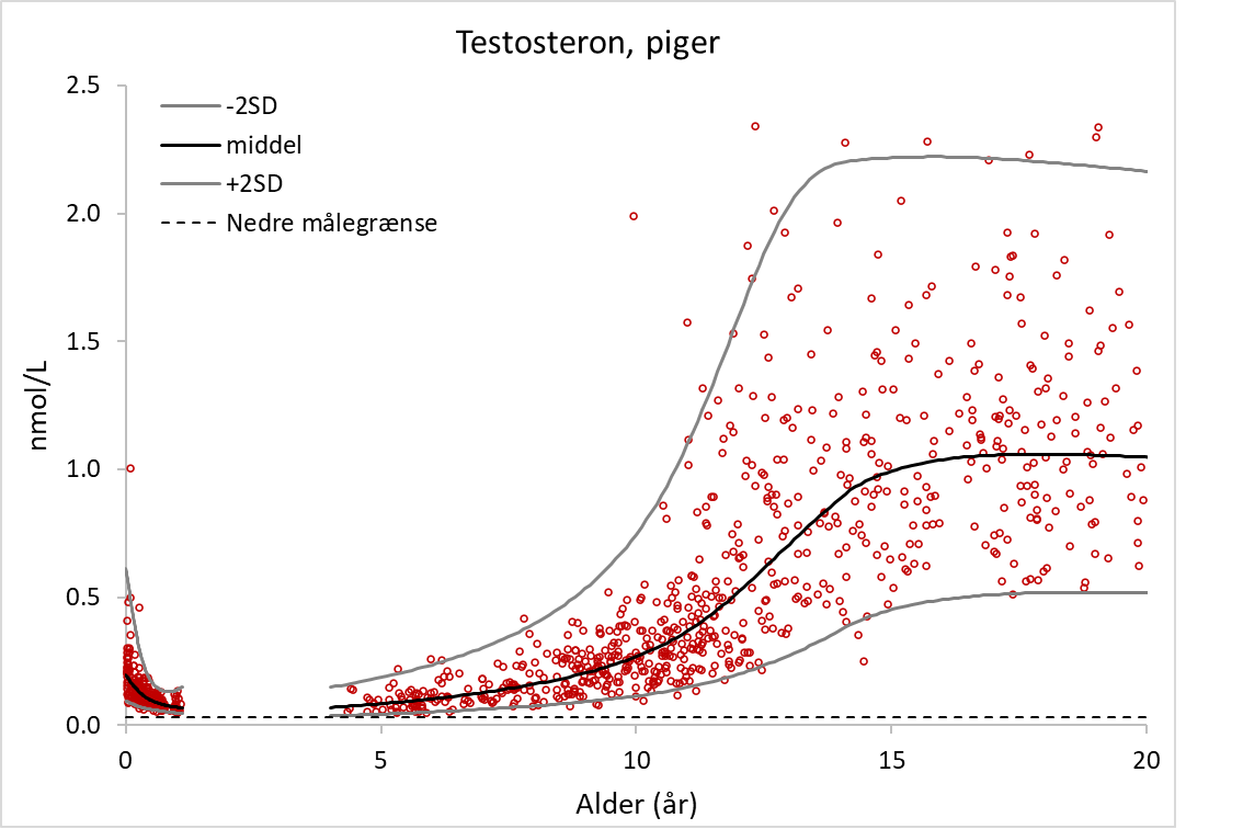 OBS – analysen udbydes kun til børn og unge under 19 år. Testosteron indgår i androgengruppen (5064GR, pæd), som er en samlet LC-MS/MS analyse af 17-hydroxyprogesteron, androstendion, dehydroepiandrosteronsulfat (DHEAS) og testosteron. Ved bestilling af androgengruppen, medbestilles automatisk SHBG, hvorved svar på SHBG og den beregnede frie (ikke-bundne) testosteronkoncentration (beregnet som beskrevet i Vermeulen et al., JCEM 1999; 84: 3666-72) også afgives. Bestemmelse af androgengruppe anvendes som led i den diagnostiske udredning af forstyrrelser i steroidsyntesen fra binyrer og gonader h ...