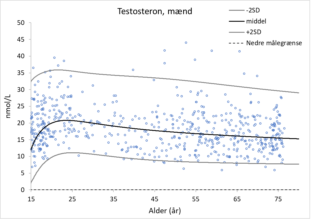 | Referenceinterval: | Reference materiale er baseret på forskellige populationer (det københavnske minipubertets studie, den københavnske mor-barn-kohorte, den københavnske pubertetsundersøgelse (COPUS II), undersøgelse af unge danske mænds sædkvalitet (DYMS) og Glostrup Helbred 2006-undersøgelse). Normalmaterialet indbefatter 1176 raske piger og kvinder og 1282 raske drenge og mænd i alderen 0-77 år. Referenceområdet er inddelt i alder og køn. Metoden til måling af testosteron i voksne mænd er en hurtig LC-MS/MS-metode, som med få modifikationer er baseret på tidligere publiceret metode (Frederiksen H, et al. Sex- and age-specific reference intervals of 16 steroid metabolites quantified simultaneously by LC-MS/MS in sera from 2458 healthy subjects aged 0 to 77 years. Clin Chim Acta. 2024, doi: 10.1016/j.cca.2024.119852). |