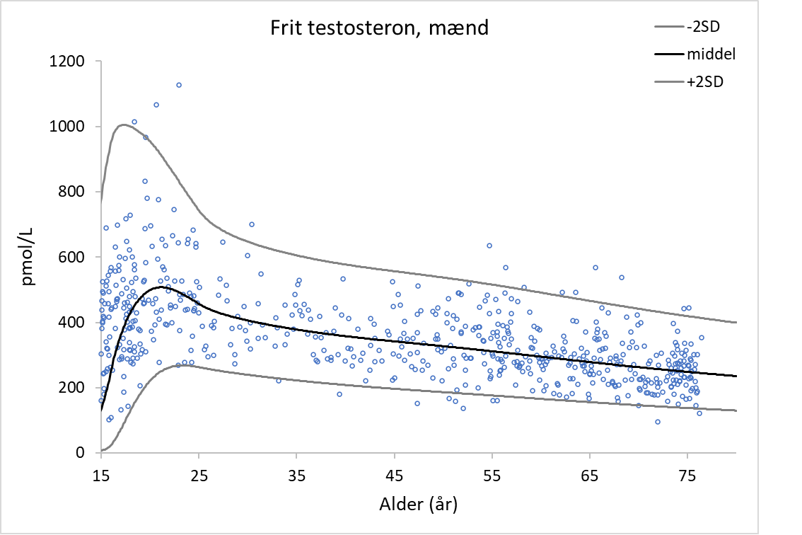 Frit testosteron beregnes ud fra målt koncentration af testosteron og SHBG som beskrevet i Vermeulen et al., JCEM 1999; 84: 3666-72 |
