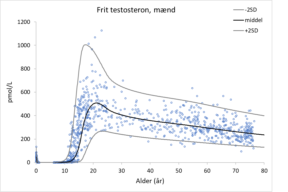 Frit testosteron beregnes ud fra målt koncentration af testosteron og SHBG som beskrevet i Vermeulen et al., JCEM 1999; 84: 3666-72 |